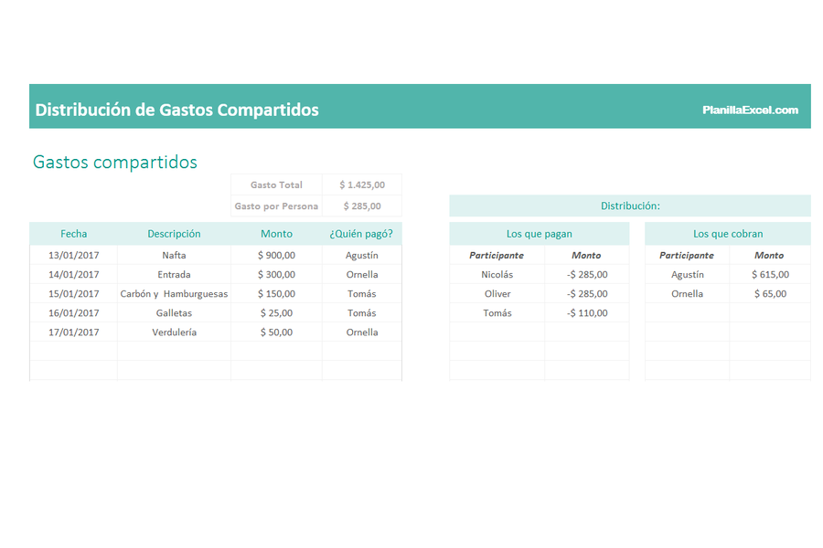 La Plantilla de Excel para Cálculo de Gastos Compartidos le permitirá obtener cuánto debe pagar y cobrar cada uno en situaciones en las que se realizan erogaciones entre distintas personas y se debe distribuir el costo.
